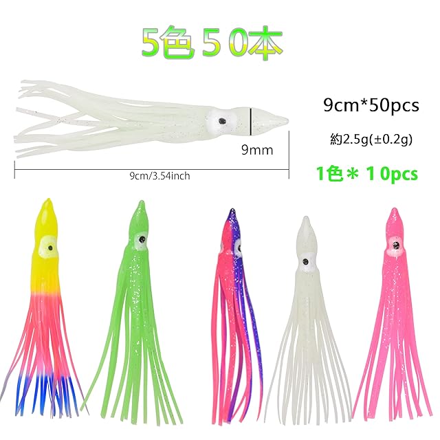 【アピールカラー】様々なシチュエーションや対象魚に対応できる様に、魚が認識しやすいハイアピールカラー5種固定色をラインアップする計50本9cmタコベイトセット 10本/1色 5種色セット:グリーン、ピンク、ピンクパープル、レーンボーと強蛍光色(※蛍光色は全身夜光効果あり、ほかのものはただアイ部蛍光効果あり、使用前に、光などに照らされた後に使用した効果はよりよいです。 )