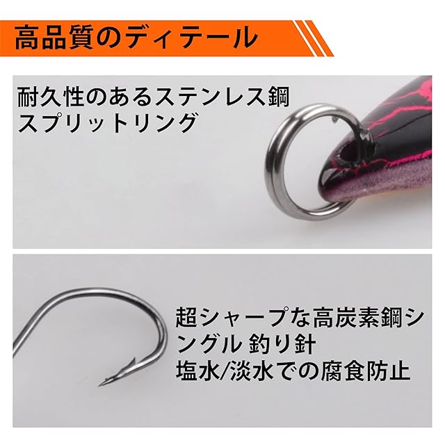 シングルフック-スーパーシャープ防食高炭素鋼フックを装備し、獲物を簡単に突き刺すことができ、魚は逃げることができません。また、シングルフックはトレブルフックに比べて魚の目や鰓へのダメージが少ないです。魚のフックを外すのにかかる時間ははるかに短くなります