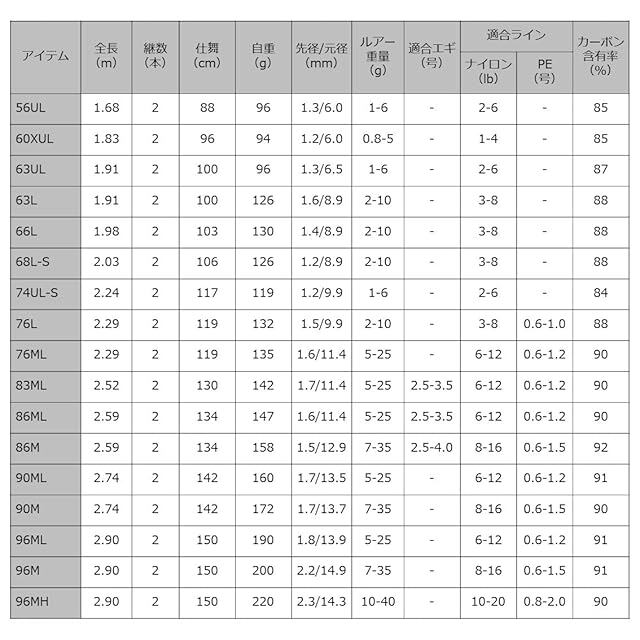 全長(m):1.68 / 継数(本):2 / 仕舞寸法(cm):88 / 標準自重(g):96