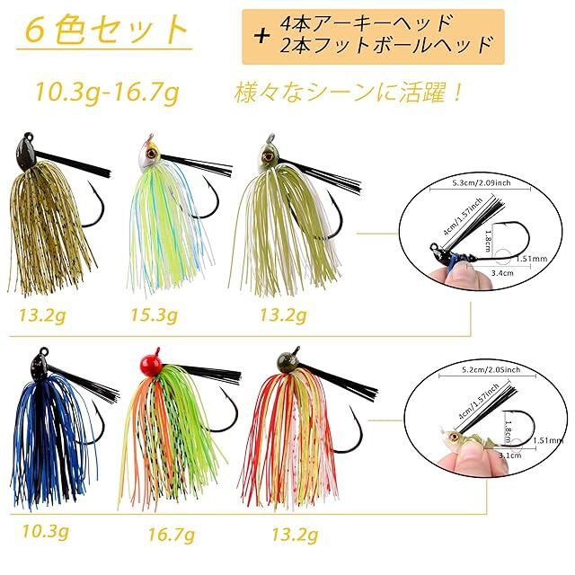 ??【仕様】素材:鉛※6本ラバージグ ※色:6色セット ※重さ:1pcs10.3g 3pcs13.2g 2pcs16.5g ※2種ヘッドタイプ(4本アーキーヘッド+2本フットボールヘッド)※シリコンスカート:約50束付き/本