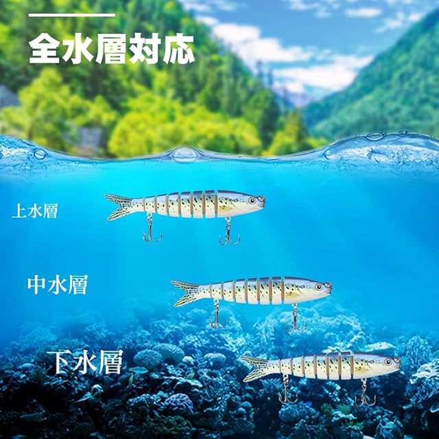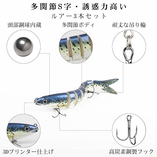 【多関節S字・誘惑力高い】:8連結ボディーからなるジョイント構造により、水の流れやリーリング時の水の抵抗を受けて、まるで魚が泳いでいるかの様な艶めかしい動きを演出。ジョイントルアーのリアルな魚鱗、頭部の鋼球によるラトル音によるバイブレーション効果と誘惑のS字系の動作は魚に強くアピールし、アクションレスポンスが高い。
