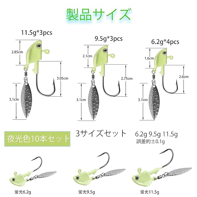 【強夜光10本ジグヘッドセット】全層使用可能のジグヘッド7-14gセット内容:7g*4pcs 10g*3pcs 12g*3pcs 収納ケース*1pcs イメージと色は一致ではない場合もございます。ご了承ください。 ラインやスナップがセットしやすいアシストフックアイ付き、ジグヘッドにローリングスイベル、リングとブレードはセットされ、1本だけでブレード付きジグヘッドを楽しんでください。付属の釣り小物で別に購入の必要がない!