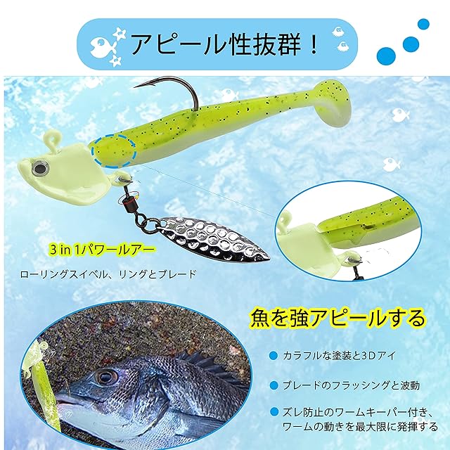 【専用フック】根掛かりしにくいシングルフック付きジグヘッドはワームズレを避ける独特なワームキーパー付き、またほとんどの魚種に対応できるマイクロバーブ付き、ワームの動きを最大限に発揮する設計。メバル、ヒラメやカサゴなどライトゲームターゲット全般に対応するフックを採用。