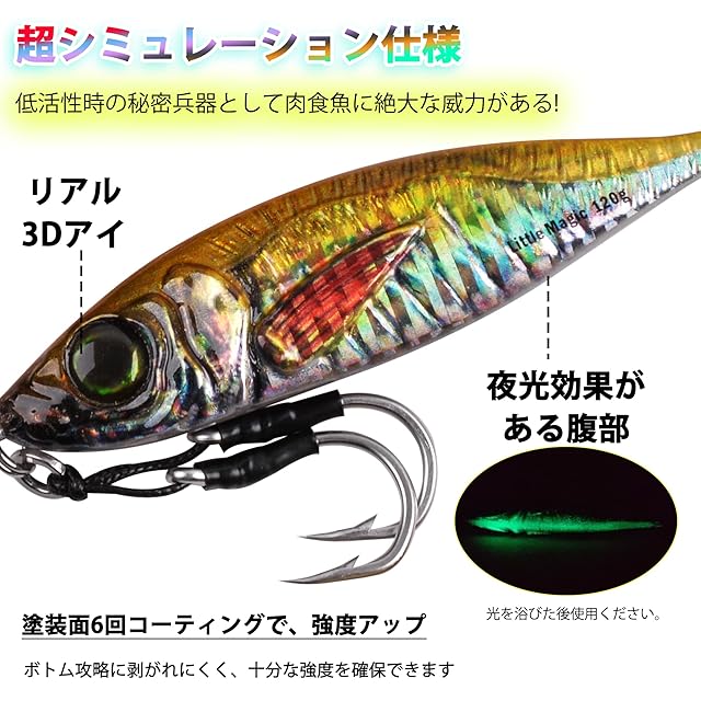 【汎用海釣りルアー】高感度鉛製メタルジグで、サビに強くて沈下迅速です。またサビに強いステンレスアシストフックだから、アクションによって海釣りや船釣りの全範囲利用できます。ただ巻きで、ウォブリングなどでターゲットにしっかりアピールし、効率的に釣りを楽しみます。マダイ、根魚、イナダ、ワカシ、ワラサ、カツオ、カンパチ、サバ、タチウオ 、ヒラマサ、ブリ、青物等に効果的です。