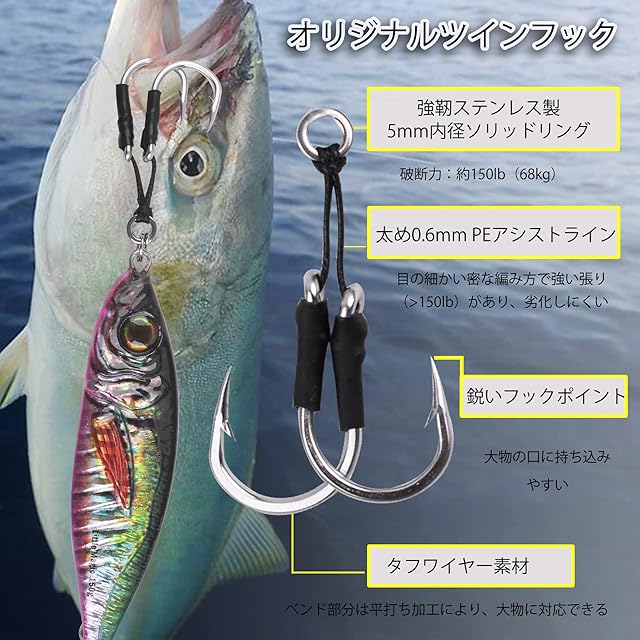 【ダブルアシストフック付きメタルジグ】フロントにダブルアシストフックをセッティングしたデザインです。スプリットリングでリアフックとフロントフックは自由に変身できます。あるいは自分でもう一つのアシストフックを装備し、前後両方ともアシストフックを付けることもできます。根がかりの確率、バイトの確率やポイントによって使い分けた方がいいです。