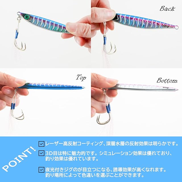 【表裏の夜光&夜釣り】夜釣や黒い海で、夜光付きのジグが目立つになり、誘導効果が高くなれます。1つのジグでさまざまな魚をターゲットにできます。釣り場所によって色違いを選ぶことができます。