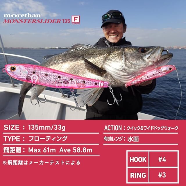 ●全長(mm):135 ●自重(g):33 ●タイプ:フローティング ●アクション:クイック&ワイドドッグウォーク ●フック仕様:#4トレブル ●リング仕様:#3 ●有効レンジ:水面