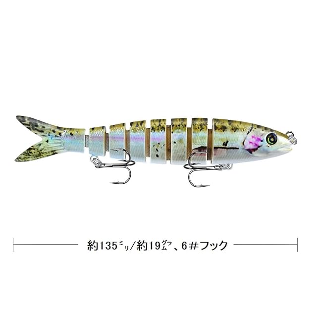 【材質】本体の固い部分はABSプラスチック製、各部の連結部分はPE製で、繋ぎのPEベルトは強靭で魚に噛まれても切れる心配はないです。フック部分は高炭素鋼製です(6#)。本体の表面ではレーザーペンキで、水中の光線を反射し、より広範囲でターゲットにアピールします。