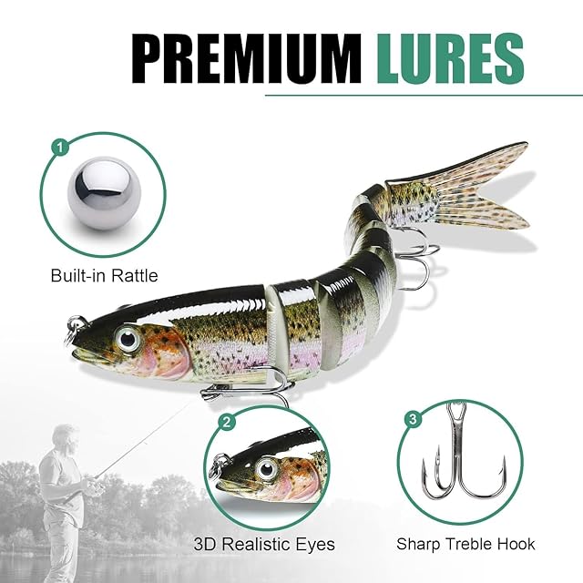 【多関節ゆらゆら泳ぎ】リアルベイトは、8連結ボディーからなる構造により、ルアーの各部は一定程度に左右動けます。ただ巻きでゆらゆらと泳ぎます。その自然な動きで多くの捕食魚を引き付けます。水の流れやリーリング時の水の抵抗を受けて、まるで魚が泳いでいるかの様なリアルな動きを演出。