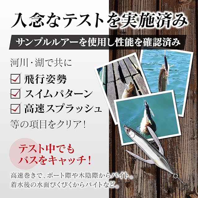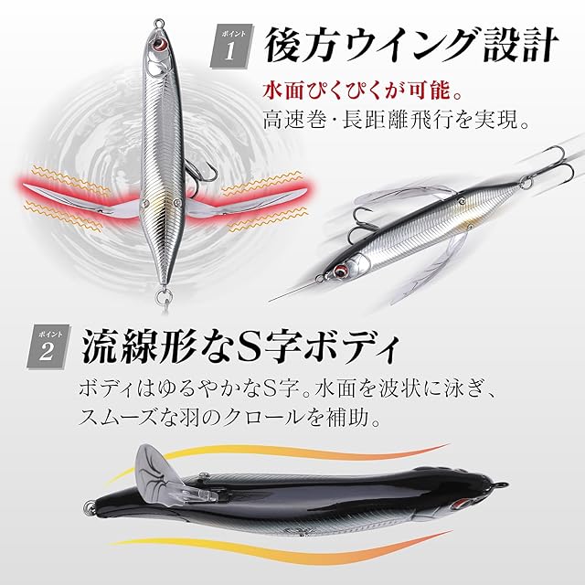 【全方向にスプラッシュ】高速でもしっかりスプラッシュアクション。/トップウォーターで全方向に水しぶきをあげ、ブラックバスを誘います。/ぴくぴくさせて「喰わせ」のタイミングも誘えるルアーです。