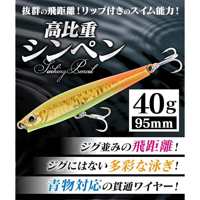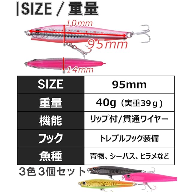 【スペック】40g(実重39g) / 95mm/トレブルフック装備/シンキングペンシル/3個セット