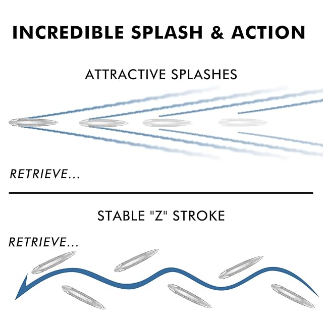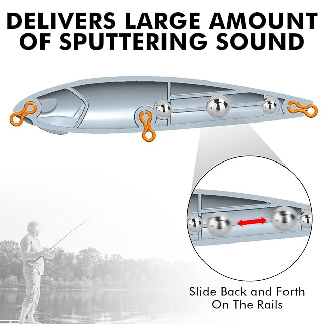 ブレードのユニークなデザイン - トップウォーターバスフィッシングルアーは、前半のスティックベイトスタイルと、回転するバックサイドが特徴で、表面を横切って移動するときに重いスパッタを提供します。 バスルアーも「転がり抵抗」があり、様々なスピードでうまく機能します。 興味深いことに、モンスターバスが釣り餌を噛むと、尻尾がバスの吐き出しを防ぎます。