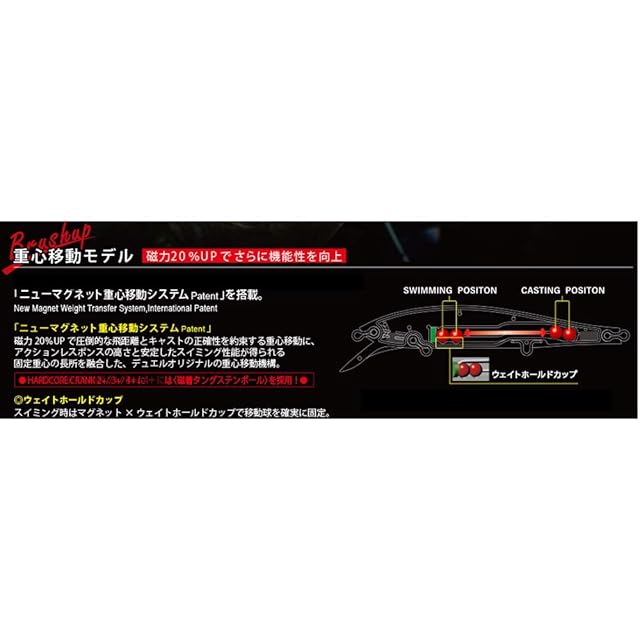 磁着タングステン+ニューマグネット重心移動システム:磁力20%UPで圧倒的な飛距離とキャストの正確性を約束する重心移動に、アクションレスポンスの高さと安定したスイミング性のが得られる固定重心の長所を融合した、デュエルオリジナルの重心移動機構。<磁着タングステンボール>を採用!