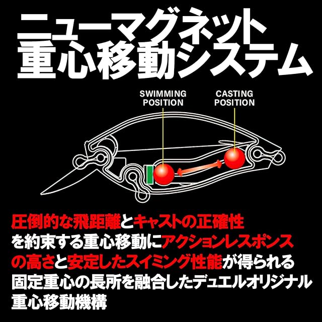 磁着タングステン+ニューマグネット重心移動システム:磁力20%UPで圧倒的な飛距離とキャストの正確性を約束する重心移動に、アクションレスポンスの高さと安定したスイミング性のが得られる固定重心の長所を融合した、デュエルオリジナルの重心移動機構。<磁着タングステンボール>を採用!
