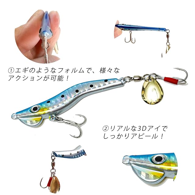 バイブレーションとメタルジグ、ミノーの要素を折衷した エギのようなフォルムで様々なアクションを演出 表層から中層のタダ巻きでのサーチや 底物狙いでボトム付近でのリトリーブやリフト&フォール、 メタルジグのように鋭くワンピッチジャーク