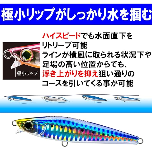 通常のシンキングペンシルとは違う極小リップ:極小リップがしっかり水を掴むので、 ハイスピードでも水面直下をリトリーブ可能。 またラインが横風に取られる状況下や 足場の高い位置からでも、浮き上がりを抑え 狙い通りのコースを引いてくる事が出来る。