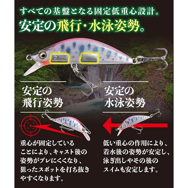 【キャスト性】固定低重心による安定姿勢。/飛行姿勢が安定しやすく、狙ったスポットを打ちやすくなり釣果の安定に。