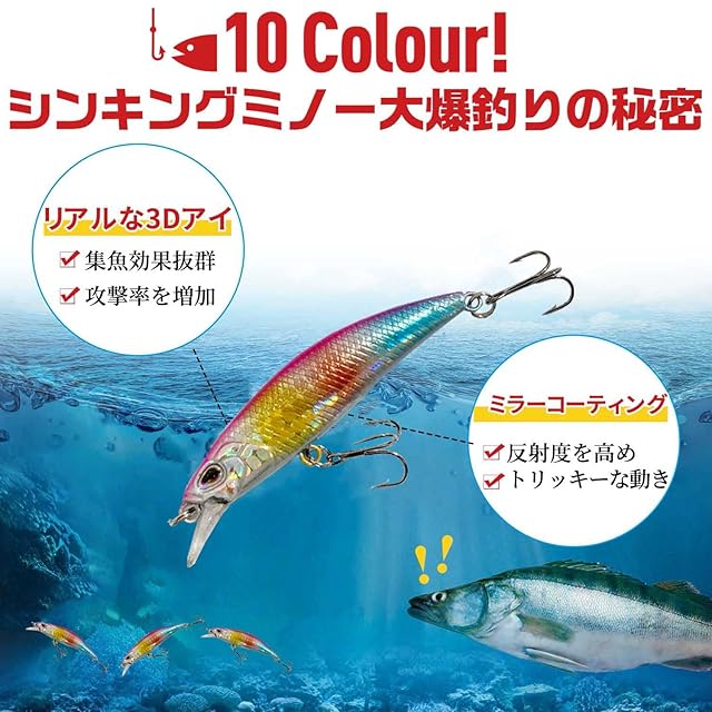 ☀【爆釣りし安い】シンキングミノー表面は光沢のある上質なミラーコーティングを施してありし、反射度を高め、水中効果は本物の魚のようで、攻撃率を増加させます。リアルな3Dアイ、集魚効果抜群!