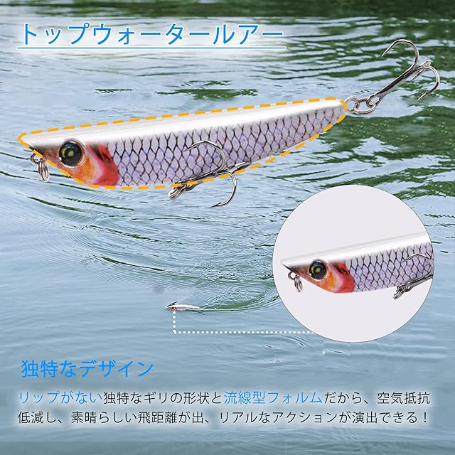 【使いやすい】ただリトリーブなどアクションで、ユラユラと泳ぎ水面に引き波がたち、小魚に似せた動きをすることができ、夏や秋など、水面にいるベイトを捕食している肉食魚に使用する頻度の多いルアーです。