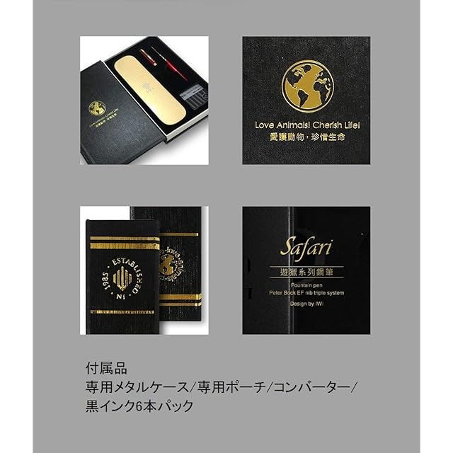 【その他】サファリは野生動物のデザインをモチーフにした万年筆。エレガントでクラッシックなスタイルの万年筆は、様々な動物の模様があしらわれています。それはまるで、野生動物がハンターの銃撃から逃れるため周りにある物の中に身を潜めているかのようです。万年筆は、ドイツ製のピーターボック社のEFサイズのペン先を使用して、安定した書き心地を実現しています。