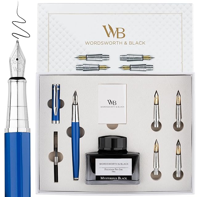 Wordsworth & Black 万年筆ギフトセット、インクボトル、6つのインクカートリッジ、インクリフィルコンバーター、4つの交換用ペン先、プレミアムパッケージ、ジャーナリング、カリグラフィー、スムーズな書き心地のペン [ブルークローム]