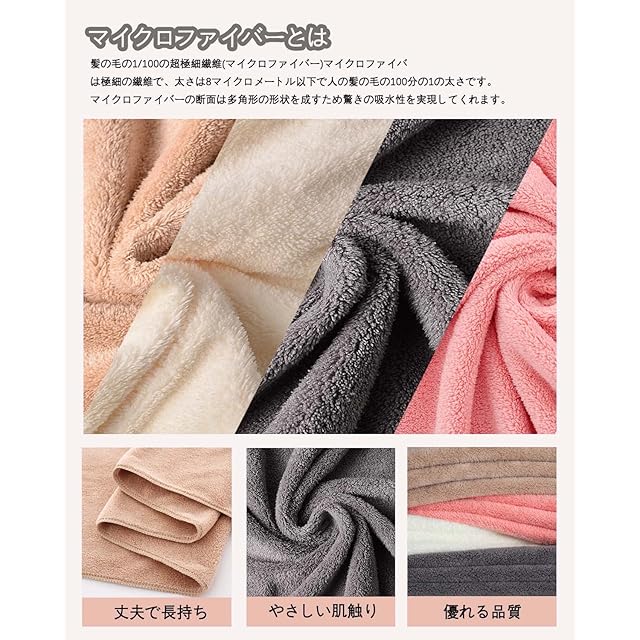 【抜群の吸水性と速乾性】綿の素材より吸水性が優れます。マイクロファイバー素材の表面は数えられない隙間があり、その隙間に大量の水分を素早い吸水できます。髪や肌にそっと当てるだけで水分が吸収される素材であり、また汚れも落としやすい特徴があります。隙間に取り込まれた空気が水分を拡散させるので、速乾性のポイントで、バスタオルの雑菌を抑え、健康を保つことができます。