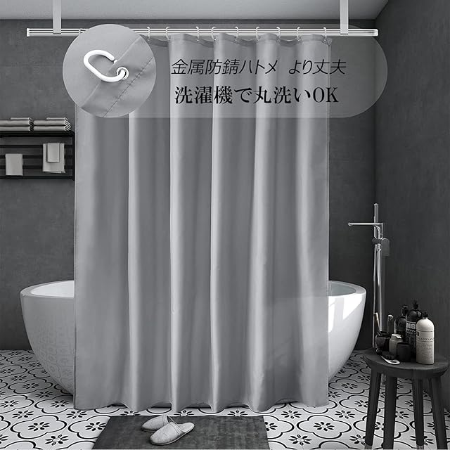 【サイズ】:幅120x丈150cm 素材:100%ポリエステル 仕様:防水防カビ パッケージ内容:本体*1+カーテンリング*8