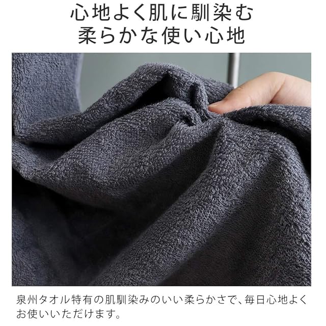 【日本製 泉州タオル】大阪泉佐野工場で織り、和泉山脈の天然水で洗い上げた泉州タオルです。タオルを織り上げてから水洗いや染色を行う泉州タオル独自の後晒製法により、使い始めから柔らかな肌触りと吸水性の良さを感じていただけます。外国製タオルが主流の昨今、身近なものだからこそこだわりたい日本製タオルです。