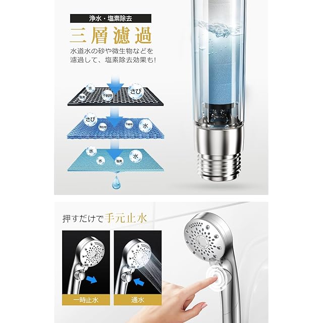 【体中ぽかぽかバスタイム★塩素除去強化版】 健康な肌と髪を保つためには、シャワー水のクオリティも重要です。シャワーヘッド 高水圧には新開発の「高効率塩素除去フィルター」を内蔵、シャワー水の中の大部分の残留塩素と水道の老朽化による不純物などをきちんとろ過できます。従来より+10%の塩素除去効果!塩素による肌や髪への負担を軽減し、乾燥やかゆみの悩みも軽減。さらに、塩素除去により保温効果も向上し、シャワー後も体中ぽかぽかが続きます。リラックスしながら肌ケアもサポートします。肌に当たる水流の感覚が均一で心地よくずっと浴びていたいくらい、家族全員での使用に適しています。