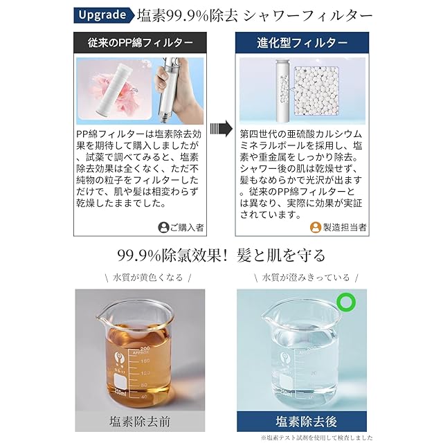 【2種類の選択肢&用途に合わせた機能】塩素除去フィルター付きの『塩素除去』タイプと、シンプルで使いやすい『標準』タイプの2種類をご用意。それぞれのニーズに合わせたシャワー体験をお楽しみいただけます。塩素除去タイプは塩素除去機能で肌や髪にやさしく、より健康的で美しい肌を目指す方にぴったり。標準タイプは軽量かつシンプル設計でどなたにもおすすめです。