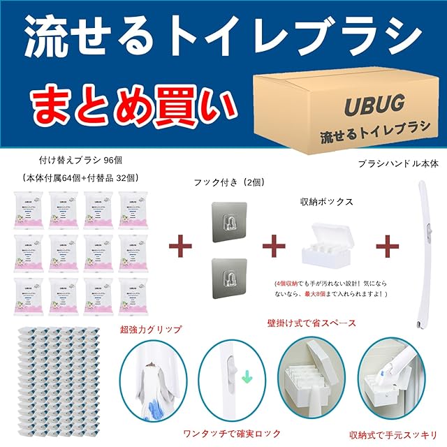 【まとめ買い】UBUG 流せるトイレブラシ トイレ掃除 ブレンドフローラルの香り 本体+付け替え96個 (本体付属64個+付替品32個) + 収納ボックス+フック付き(2個) トイレ洗剤 トイレブラシ 使い捨て 洗剤 汚れが落ちる 衛生 清潔 掃除道具 (混合型の香り, トイレ 1 つ分用)