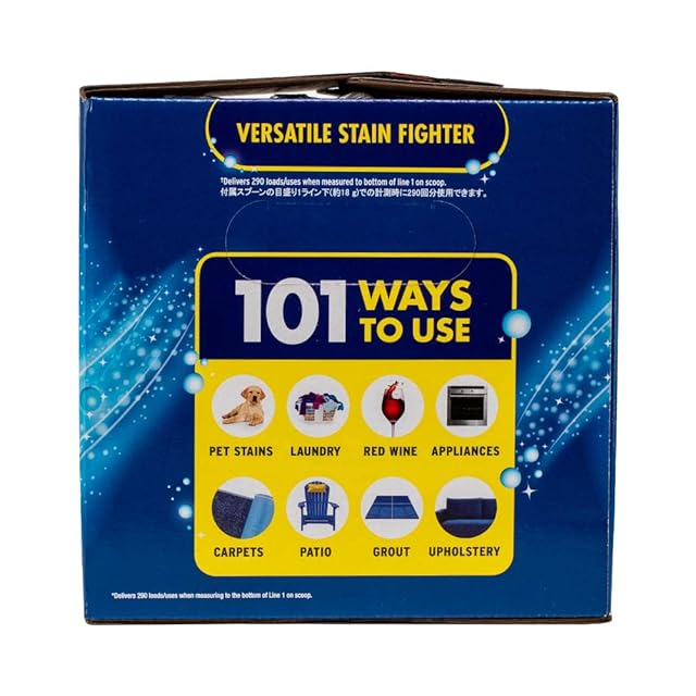 【オキシクリーン】<br>衣類のシミや水まわりのしつこい汚れ、キッチンの油汚れから洗濯槽まで頑固な汚れやシミを浮かして落とす万能クリーナーです。酸素系漂白剤なので臭いも気にならず、汚れだけを落とすので色物・柄物の衣類にも安心してお使いいただけます。消臭効果もあり、臭いもすっきり。普段のお洗濯からキッチン、排水溝のヌメヌメ、お風呂やトイレなどの水まわり、食器やお鍋などの汚れから窓や床のお掃除まで家中を綺麗にしてくれます。<br><br><使い方><br>(1)40℃~60℃の少し熱めのお湯にオキシクリーンを完全に溶かします。<br>(2)汚れを落としたいものを20分以上漬け置きします。<br>(3)漬け置き後、衣類は通常のお洗濯、その他は綺麗に洗い流してください。<br><br><br>《ご使用上のご注意》<br>・必ず目立たないところで試し、乾燥後に色落ちがないことを確認してからご使用ください。<br>・熱湯では効果が落ちるのでご使用にならないでください。<br>・密閉容器で保存しないでください。酸素が発生し続け、破裂する恐れがあります。<br>・溶液は長時間置くと有効性がなくなります。作り置きはせず、6時間以内に使い切ってください。<br>・洗濯洗剤以外(アンモニアを含む製品、塩素系漂白剤、その他の家庭用化学洗剤)とは併用しないでください。<br>・直射日光を避け、お子様やペットの手の届かないところに保管してください。<br><br><br><パッケージに関しまして><br>こちらの商品は、箱の中で袋から粉が漏れている場合がございます。<br>外部に漏れ出るのを防ぐため、箱の底をテープで補強させていただいておりますので、<br>あらかじめご了承くださいませ。<br>また、入荷時期によってパッケージデザインが異なる場合がございます。<br><br>OXC-0001-000