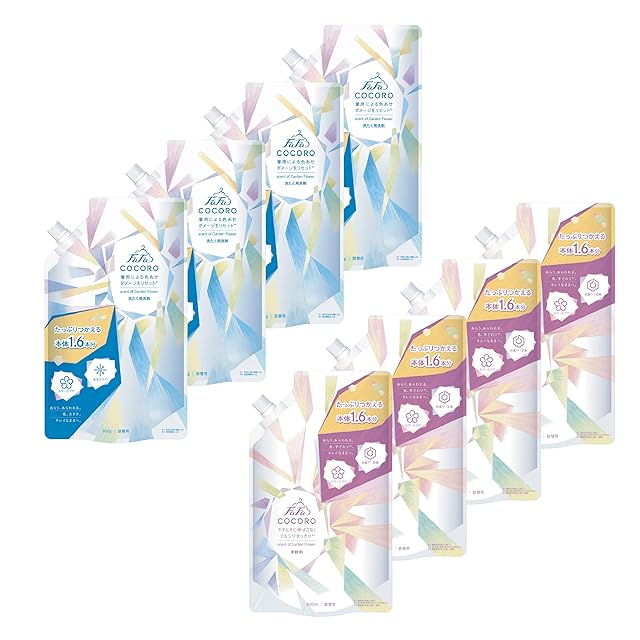 ファーファ ココロ 心安らぐ 花束 の香り 洗濯用 液体 洗剤 詰替 ( 800g ) 4個 + 柔軟剤 詰替 ( 800ml ) 4個 セット<br><br> ●あらう、あらわれる。色、カタチ、キレイなままへ。ファーファ ココロ シリーズがリニューアル。<br> ●たっぷり使える詰替用は本体1.6本分。<br> ●干すときに伸ばさなくてもシワすっきり。<br> ・例えばドライコースで1回お洗たくをした後、干すときに衣類を伸ばさなくても、シワがすっきりする嬉しい仕上がりに。<br> ※柔軟剤不使用と比較して。<br>●洗たくによる色あせを防ぎます。<br> ・ドライコースで25回繰り返しお洗たくをしても、変わらず色褪せ防止効果があることを確認。<br> ※柔軟剤不使用と比較して<br>※当社試験法による。<br>●抗菌※・防臭。<br>・着用中の汗・皮脂によるニオイの発生をブロックします。<br> ※すべての菌に効果があるわけではありません。<br>●心安らぐ花束の香り。<br>・洗い立ての香りの印象はそのままに、リニューアル前よりも乾いた後の香りがアップ。<br>・やさしい生花の香りはそのままです。<br> <br>< 使用上の注意 ><br> ・子供の手が届く所に置かないでください。<br> ・認知症の方等の誤飲を防ぐため、置き場所に注意してください。<br> ・用途以外に使わないでください。<br> ・荒れ性の方や長時間使用する場合、また原液で使う場合は炊事用手袋を使用してください。<br> ・使用後は手を水でよく洗い、クリーム等でお手入れをしてください。<br>・ 洗濯機のフタ等のプラスチック部分に洗剤がついたまま放置すると痛むことがあるので水ですぐにふきとってください。<br> ・高温や低温、直射日光等を避けて保管してください。<br> ・やわらかい材質のため、持ち運びや保管時の破損に注意してください。 <br><br> < 応急処置 ><br> ・目に入った時は、こすらずすぐに流水で充分に洗い流してください。<br> ・飲み込んだときは、吐かずに口をすすぎ水を飲む等の処置をしてください。<br> ・異常がある場合は、商品を持参し医師に相談してください。