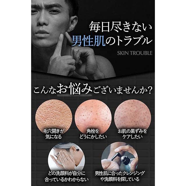 【クレンジング】今や、男性の日々の洗顔でもクレンジング料が選ばれています。クレンジングは皮脂汚れをしっかりと落とし、タンパク質汚れは程よく落とすため汚れを落としすぎず、お肌に負担をかけずに洗顔できます。また、男性のあらゆる毛穴の大きさに対応する植物性のスクラブを配合。毛穴汚れ、黒ずみをケアしながら、ハリ・うるおいを与えます。