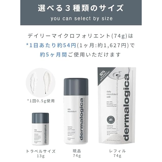 <使用方法> クレンジングや洗顔の後、手のひらに小さじ一杯分くらいの量を取り、少量の水を加えてペースト状、または水を少し多めに加えて緩めの状態に泡立てます。水の量でお好みのテクスチャーに調整いただけます。目の周りを避け、濡れた顔全体に優しくマッサージするようにらせん状にくるくるします。酵素が古い角質をゆるめ、お米のスクラブが肌を磨き上げます。肌の敏感な方は肌の様子を見ながら力加減を調整してください。強くこすらないようご注意ください。ぬるま湯で十分に洗い流します。洗顔料が残りがちな髪の生え際やあごもしっかりすすいでください。洗い流した後は余分な角質が取れてなめらかなつるつる肌を体感いただけます。すすいだ後は柔らかいタオルなどで軽く抑えるように水をふき取り、肌が渇く前に化粧水やモイスチャライザーなどで肌にたっぷりとうるおいを与えてください。 <使用ステップ> クレンジング→洗顔→デイリーマイクロフォリエント→化粧水→美容液→保湿剤 ・1日1回、朝か夜のどちらかにご使用ください。 <使用目安期間>約2週間~1か月分 <1回あたり>0.5g <英語名>daily microfoliant travel size <使用上の注意>直射日光のあたる場所、高温多湿の場所、温度変化の激しい場所を避け、常温で保管いただけますようお願いいたします。