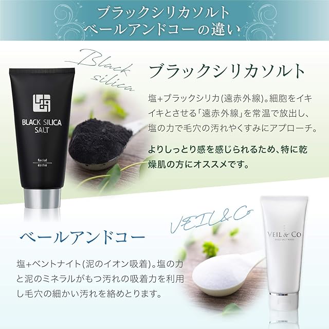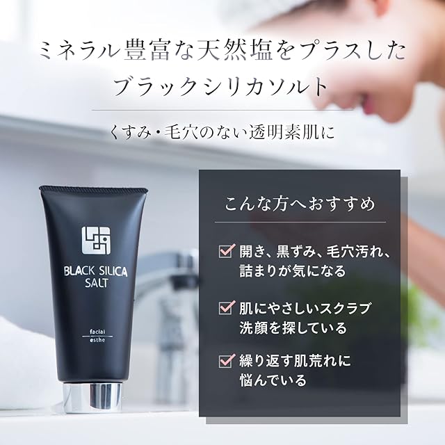 ブラックシリカソルト フェイシャル エステ<br> <br> 【至福のソルトケア】磨き抜かれた天然ソルトと天然鉱石ブラックシリカを配合した塩スクラブ洗顔。洗顔・保湿・パックを兼ねたオールインワン洗顔料。<br> 【自宅で塩サウナ】ブラックシリカは遠赤外線を常温で放出しており、自宅で塩サウナを体験できます。<br> 【角が丸いやさしい塩】ブラックシリカソルトに採用している塩は粒子を円形に丸く加工し、大きさを均等にしているため肌にダメージを与えません。<br> 原産国:日本<br> 内容量:180g(約2ヶ月分)<br>