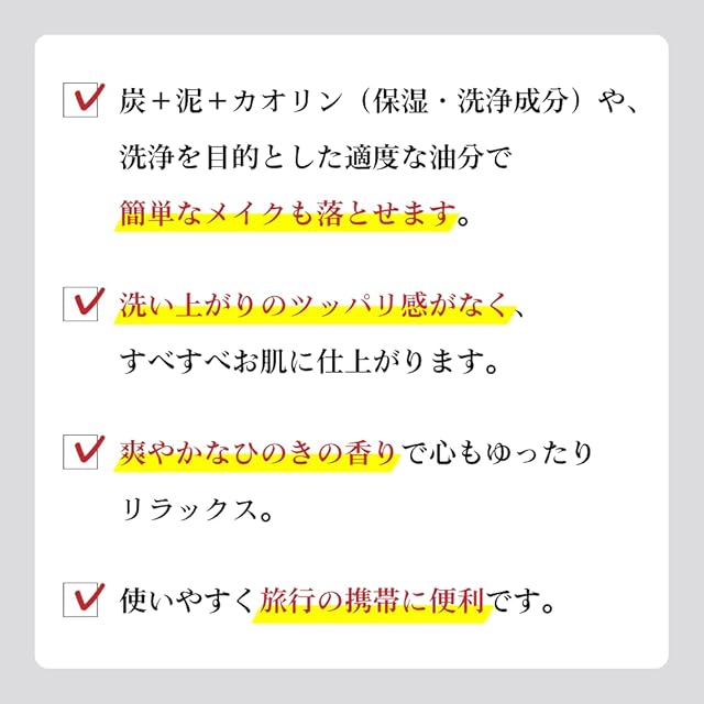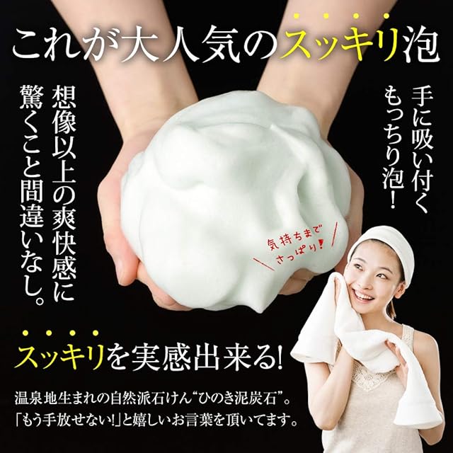 ○洗浄を目的とした油分を配合して、簡単なメイクも落とせます。<br>○洗い上がりのツッパリ感がなく、すべすべのお肌に仕上がります。<br>○炭+泥+カオリン(保湿・洗浄成分)でメイククレンジングも実現可能です。<br>○使い勝手がよく、幅広い年齢層のアプローチとして最適です。<br><br><b>【素肌すっきり】</b><br>温泉でツルツルになったあのお肌をご自宅でも。たっぷりモチモチ泡で優しく洗顔。<br><b>【ひのきの香りとリラクゼーション】</b><br>良質なひのきオイルを独自に配合。自然なひのきの香りでリラックス効果が期待できます。<br><b>【商品の仕様】</b><br>内容量:120g×6本/日本製<br><b>【チューブタイプ】</b><br>人気の洗顔石けんが使いやすいチューブタイプになりました。<br>旅行やちょっとしたお泊りの際にも便利です。<br><b>【贈り物やギフトに】</b><br>自分用はもちろん、ちょっとしたお土産やプレゼントにもお使いいただけます。