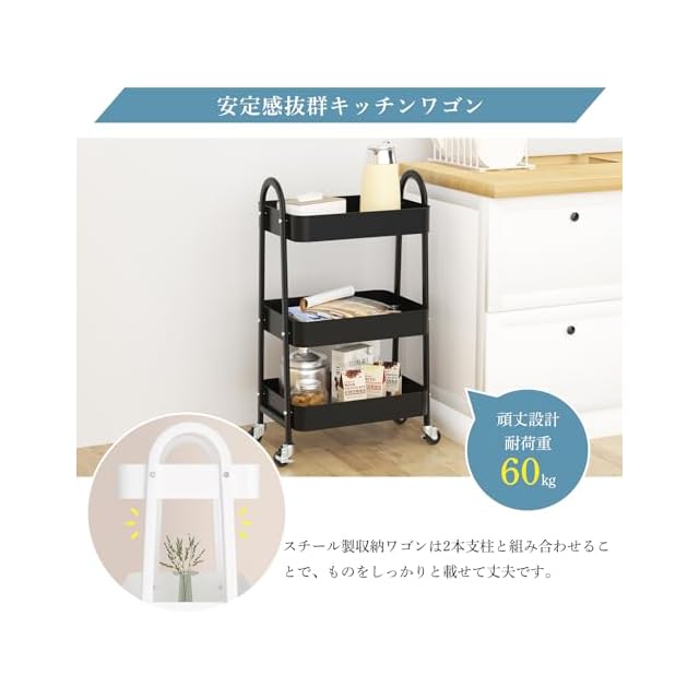 【キッチンワゴン 安定感抜群】材質:スチール製(粉体塗装)。静耐荷重:約60kg。このキッチンワゴンはスチール素材で構成されており、収納を強力に保護し、満載時でも安定した機動性を発揮し、ボトルなどの重たい物も安心して収納できます。このキャスター付きワゴンにはA型パイプを搭載した頑丈設計で変形しにくく、しっかり支えるから、ぐらつく心配がありません。